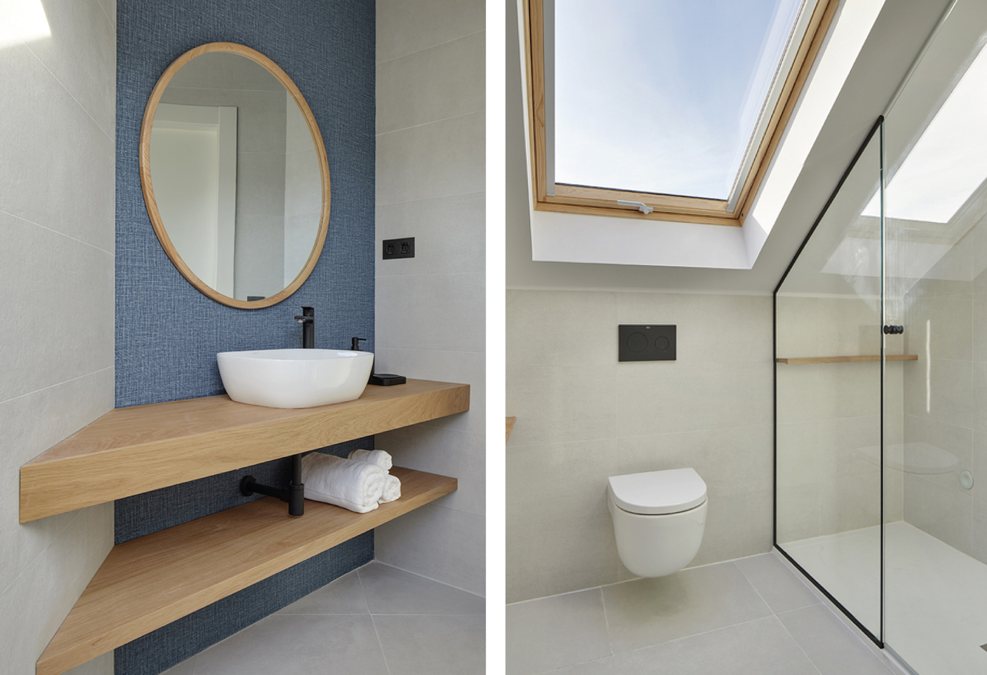 Su filosofía, según comenta él en su web, no puede ser más clara: “Te doy las ideas, la confianza y el mimo para transformar tu casa en un hogar”. Lo cual se aprecia en una de sus viviendas más recientes en Bilbao, el Ático XZ, en el que se combina la antigua estructura de la casa con la nueva, aplicando juegos de alturas, vidrieras corridas y lucernarios en los techos. En uno de los dos baños, los cerámicos procedentes de nuestra marca Colorker (en concreto, el modelo Atelier Moon) reinterpretan en suelos y paredes la superficie del cemento. Además, Vildósola acompañó las baldosas con un papel de pared azul que, junto a la encimera y el espejo (ambos de madera), genera un maravilloso contraste de color y textura.