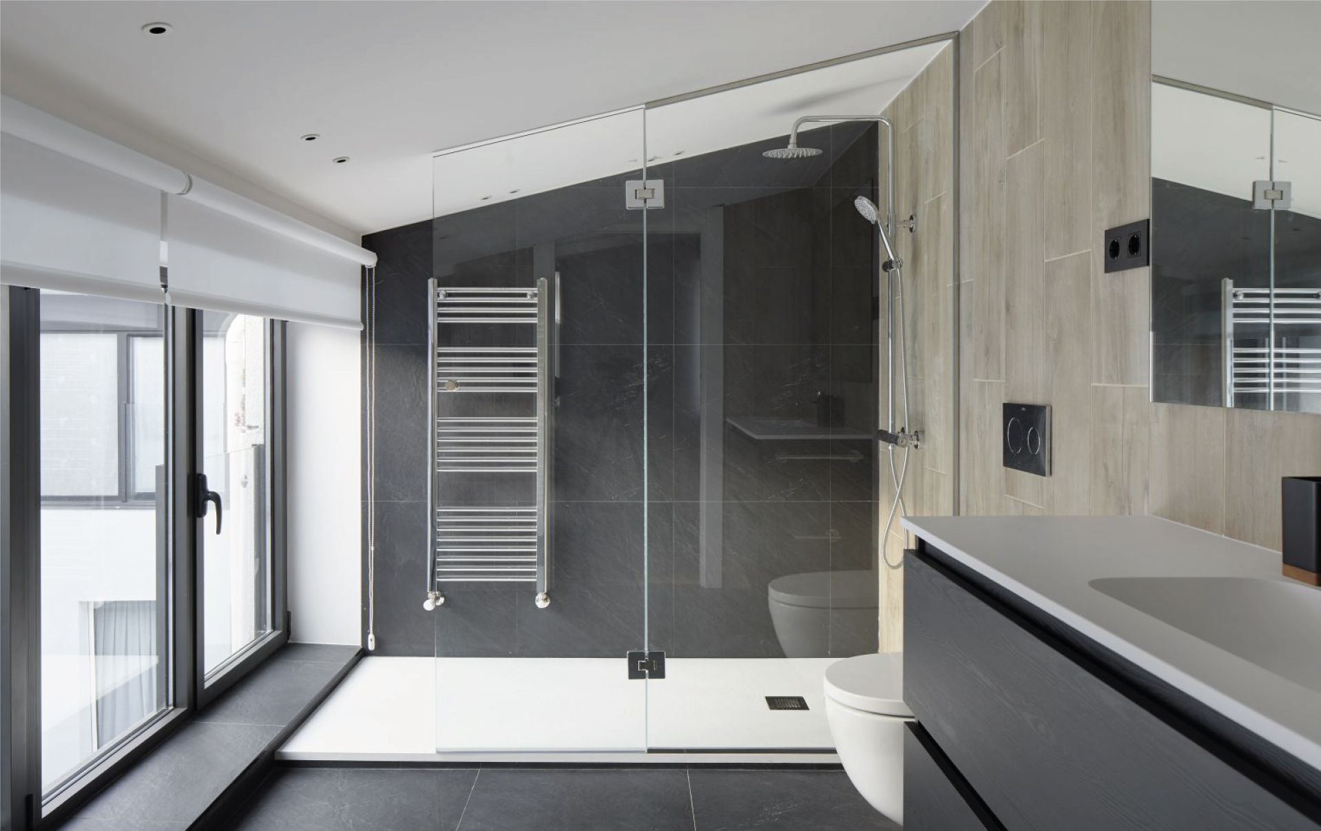 A simple vista, y sobre todo por sus formas, en la estancia se palpa la impronta arquitectónica que el vasco también dejó en el otro baño del Ático XZ: la pared del mueble se reviste con el modelo Norden Natural de la firma Colorker que en Himabisa le proporcionamos, mientras que las baldosas de la pared de la ducha y las del suelo corresponden al modelo Mystone Lavagna Nero, de una de las marcas más destacables en nuestro catálogo, la italiana Marazzi. ¡En nuestro perfil de Instagram, muy pronto, compartiremos los detalles de este segundo baño que Borja Vildósola diseñó con una rotunda sencillez! ¡Estad atent@s!