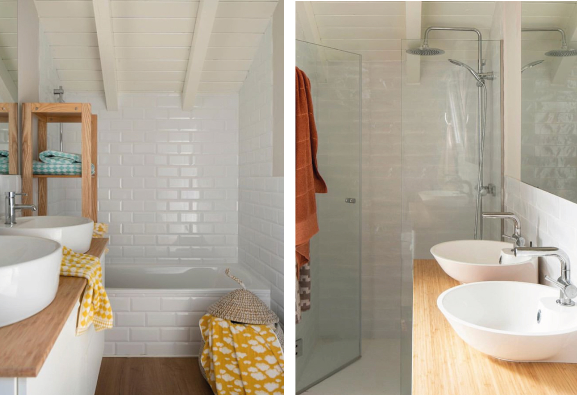 Para el baño de los niños, la solución que las dos interioristas trazaron se aleja bastante del concepto “infantil”, y eso hace que la estancia gane en originalidad y perspicacia a todos los niveles. Es decir, al haber respetado la estructura original de los techos, lo que Beatriz y Lorea consiguieron es un efecto rústico, idéntico al que predomina en las casas de campo de antaño, que aquí se potencia con las baldosas blancas de las paredes (de la colección Mugat de nuestra firma castellonense Vives). ¡Y también con los grifos de Tres Grifería que, durante la obra, Studio Pacas escogió del catálogo de Himabisa!
