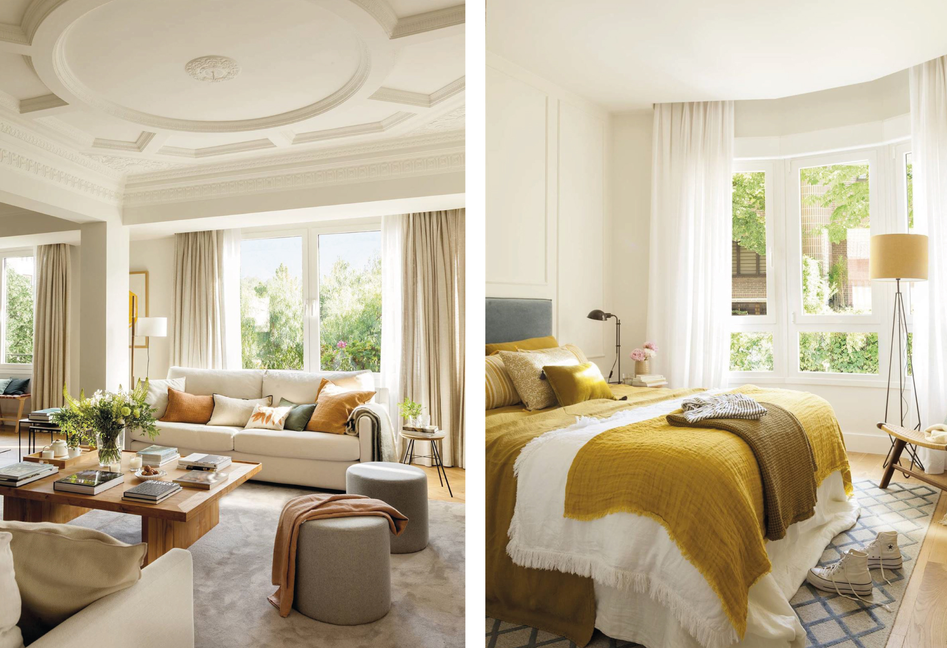 A la izquierda, el salón que el estudio de Sandra Vergara reformó en la vivienda de la Gran Vía de Bilbao. A la derecha, una imagen del dormitorio principal. Revista El Mueble / Estilismo: Solange Van Dorssen / Fotografías: Felipe Scheffel