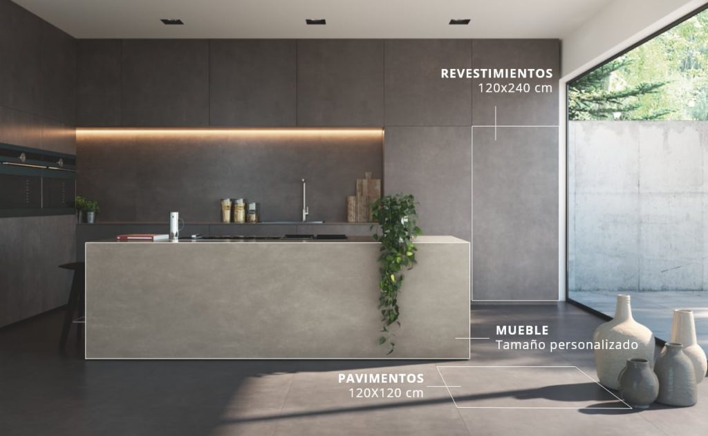Una serie de formatos inéditos de tamaños de más de 160×320 cm, organizados en diferentes y variadas estéticas y materiales para todas sus aplicaciones. Tanto en pavimentos y revestimientos, como fachadas ventiladas, decoración de interiores y también decoración de exteriores.