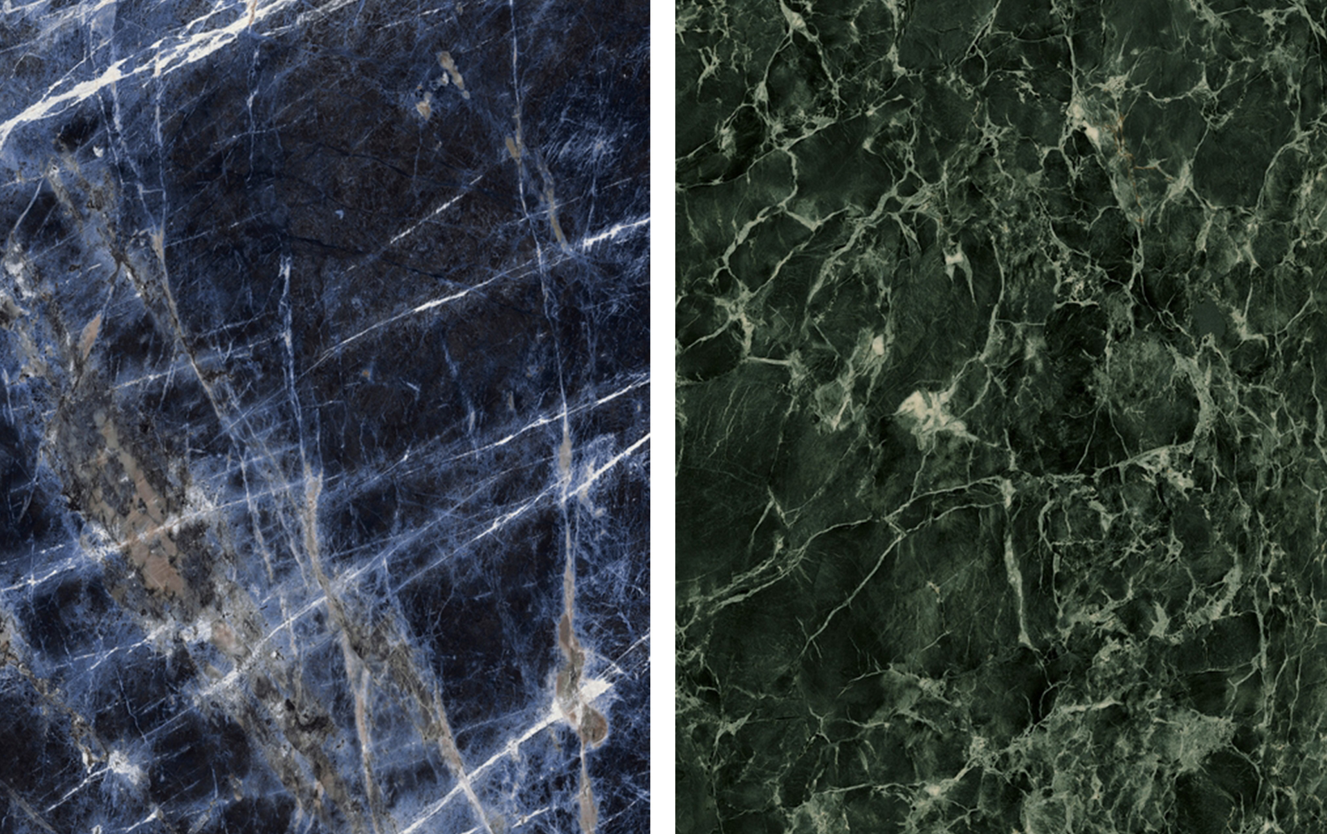 De cerca, estas son las vetas que presentan los dos modelos ‘Sodalite Blu’ (a la izquierda) y ‘Verde Aver’ (a la derecha) de la colección ‘Grande Marble Look’ de Marazzi.