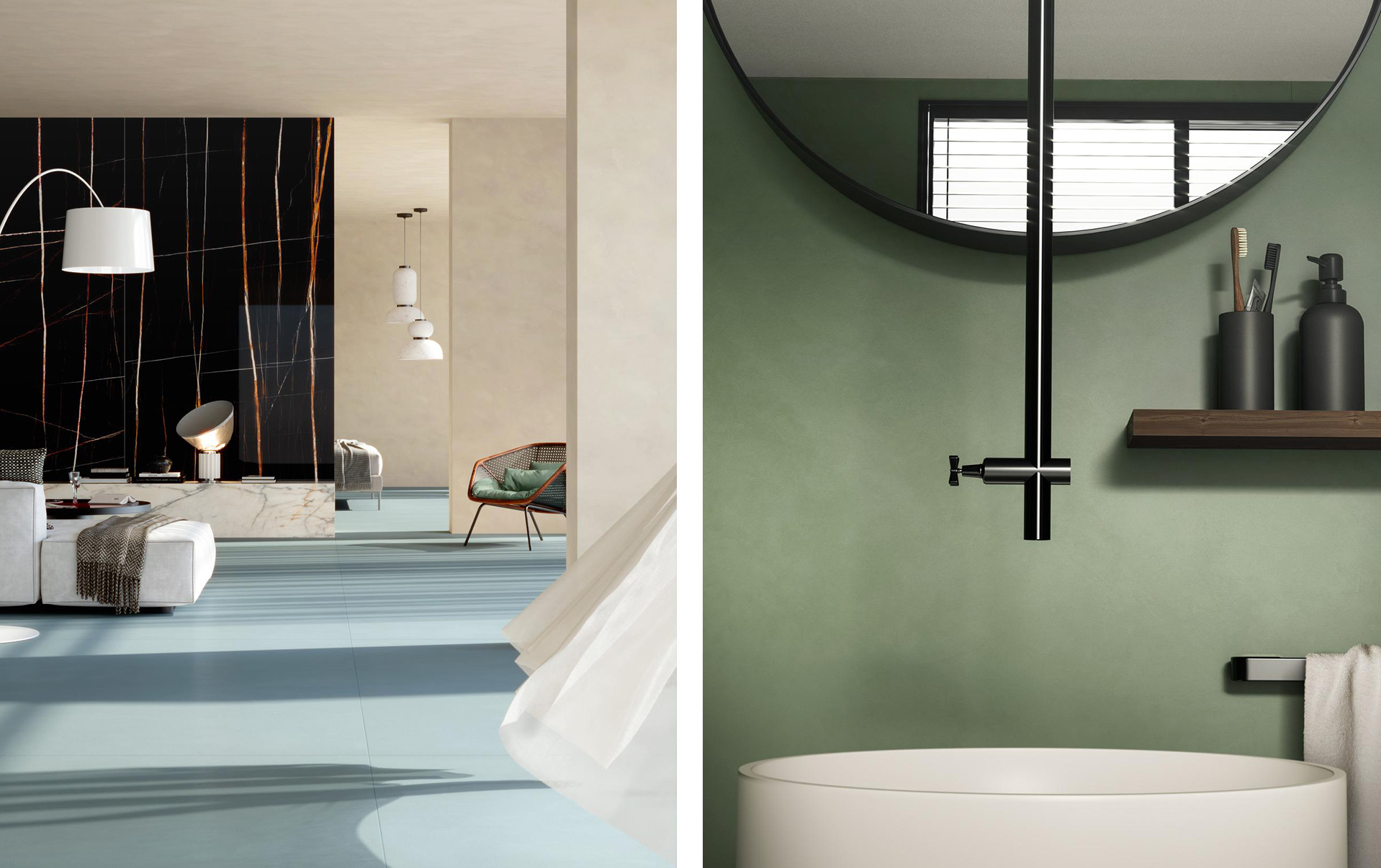 A la izquierda y derecha, el modelo ‘Grande Resin Look’ de Marazzi en azul y verde, disponibles ya en Himabisa Bilbao.