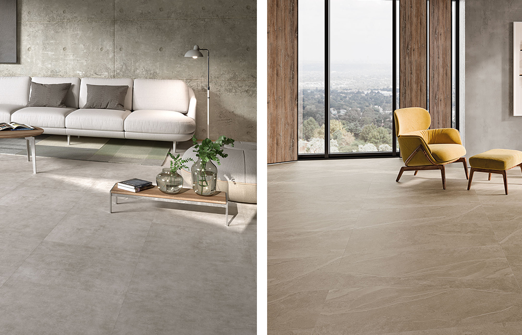 La colección Concrete y Creta de New Tiles, a la izquierda y derecha respectivamente.