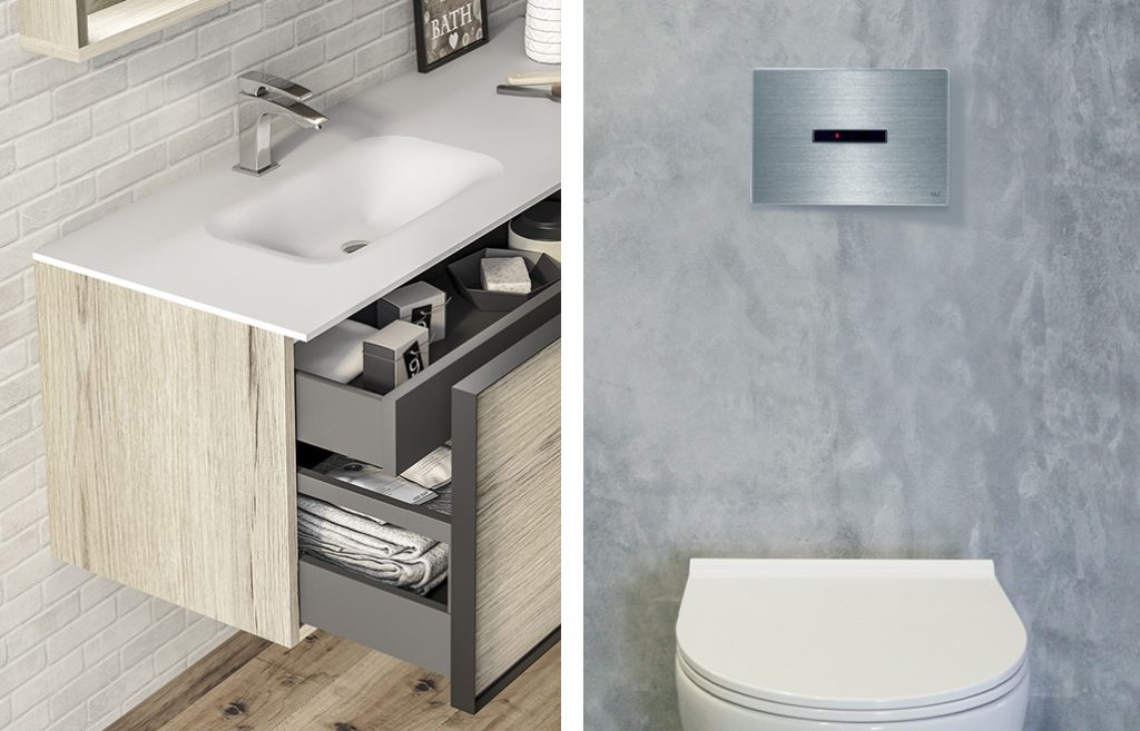 Así son los muebles de baño de la marca Di-bany (a la izquierda), junto a las soluciones técnicas de pulsadores para inodoros de Oli (a la derecha).