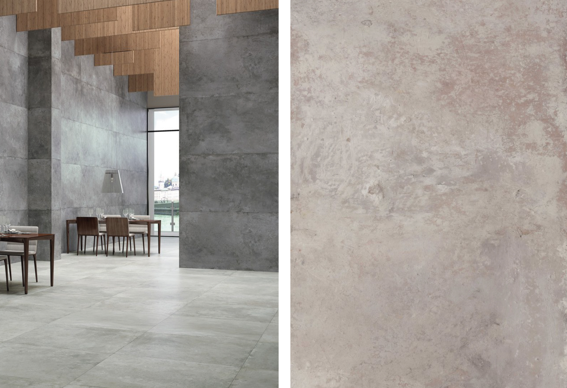 Coverlam subraya la pureza del hormigón con los diseños Tempo Gris (a la izquierda) y Tempo Smoke (a la derecha).