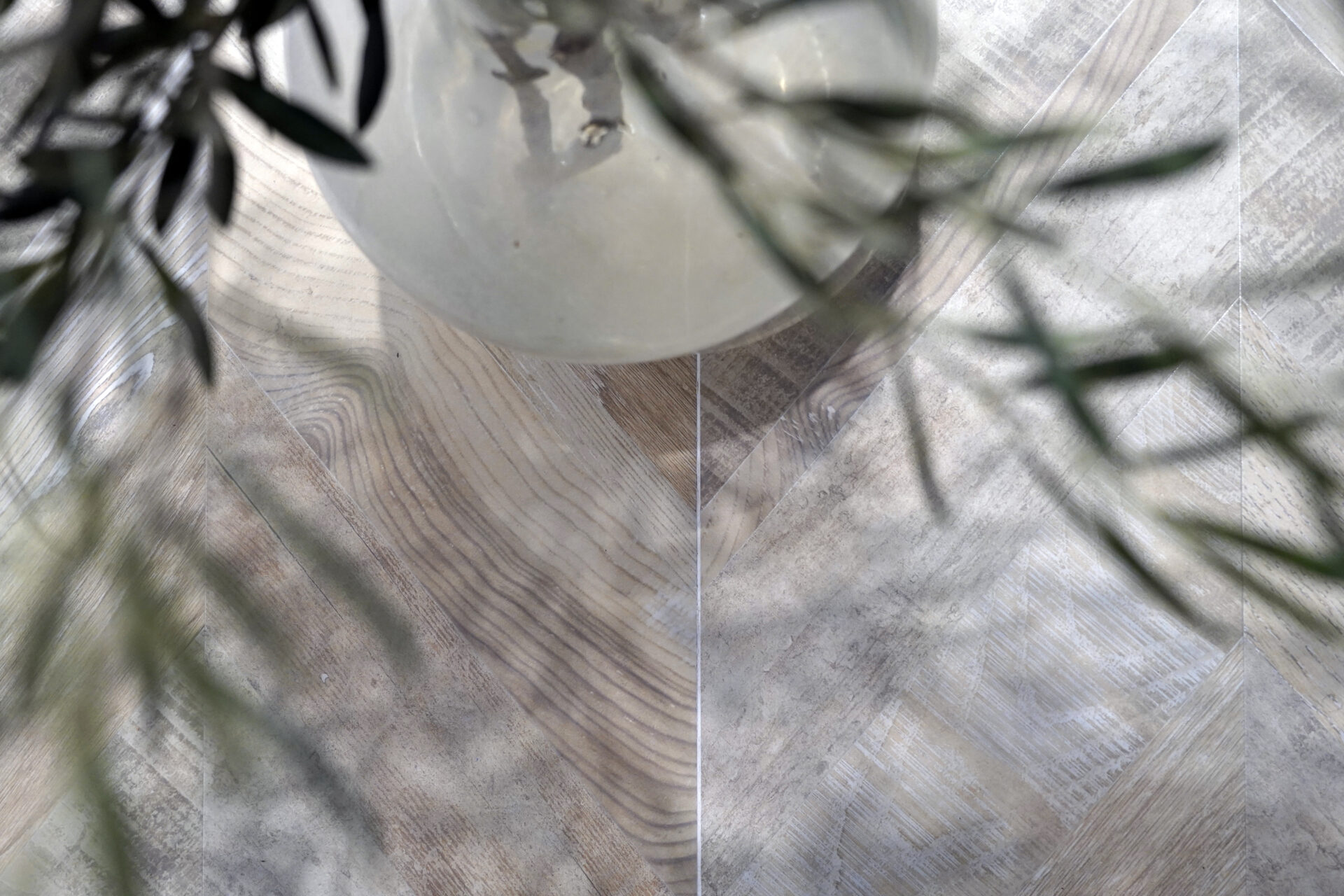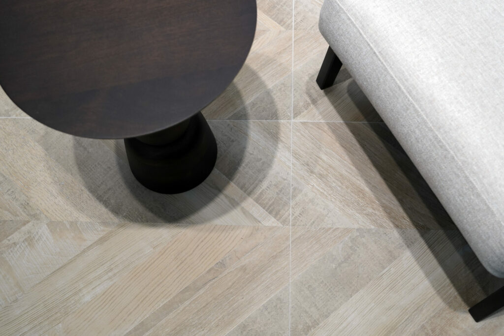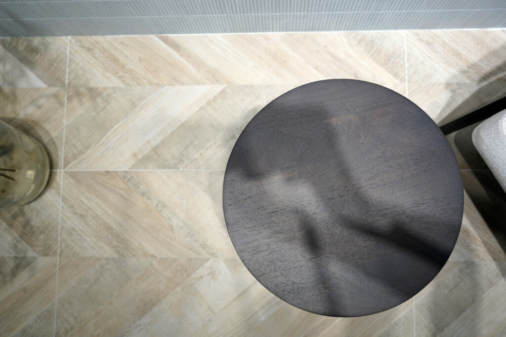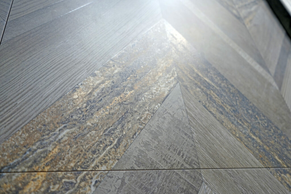 La Colección Chevron de Cerámicas Aparici en su versión Stamp. Su combinación de madera y travertino, junto con un sutil veteado dorado, ha cautivado a los profesionales del diseño que buscan un pavimento sofisticado y versátil.