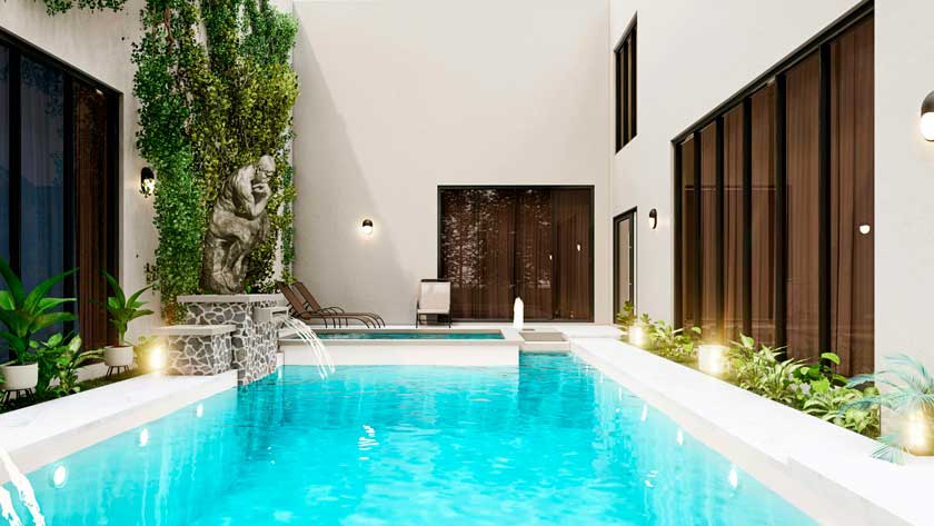 El espacio dedicado a la piscina, como la foto que acompaña a continuación, nos traslada a un pequeño oasis y lugar de calma. Donde la protagonista es el agua, y esto aporta mucha paz y tranquilidad al espacio ubicado entre paredes y con luz exterior.