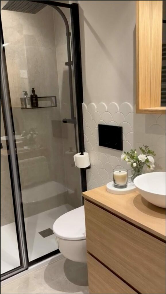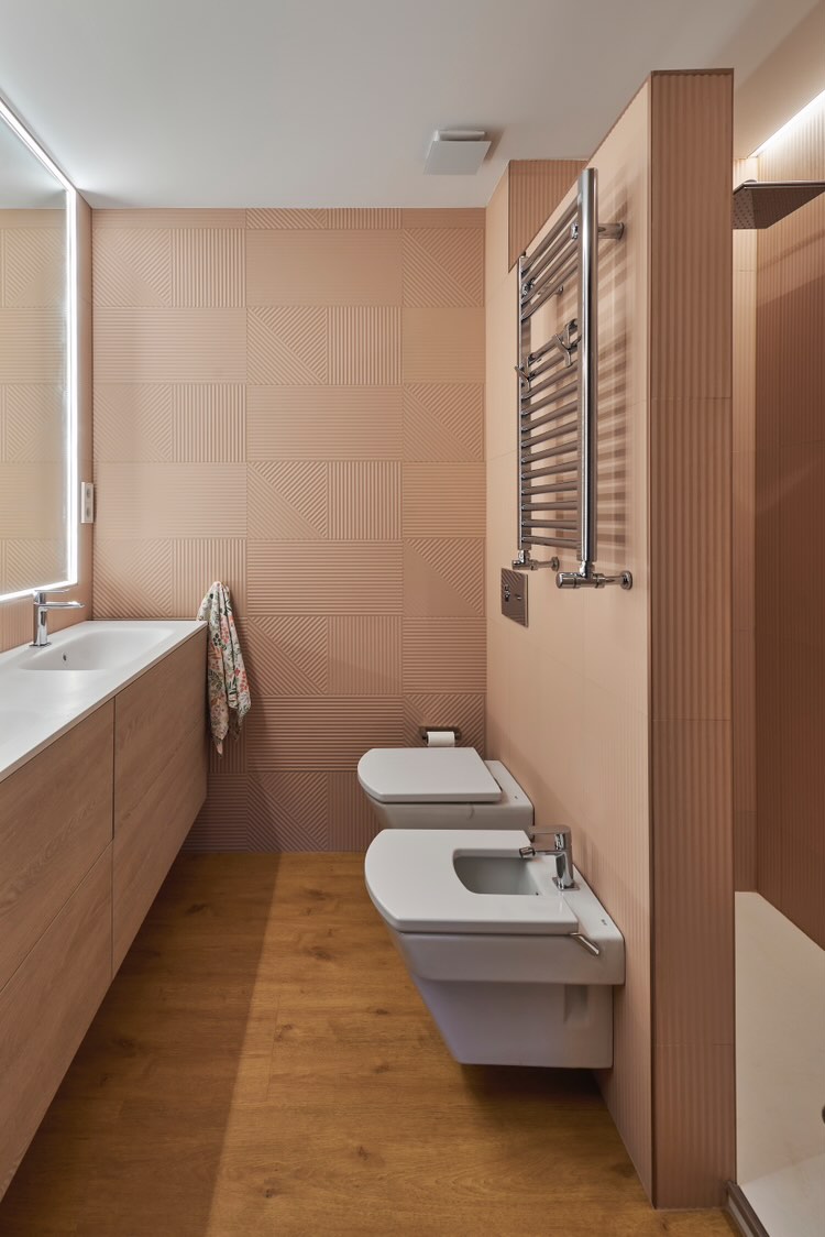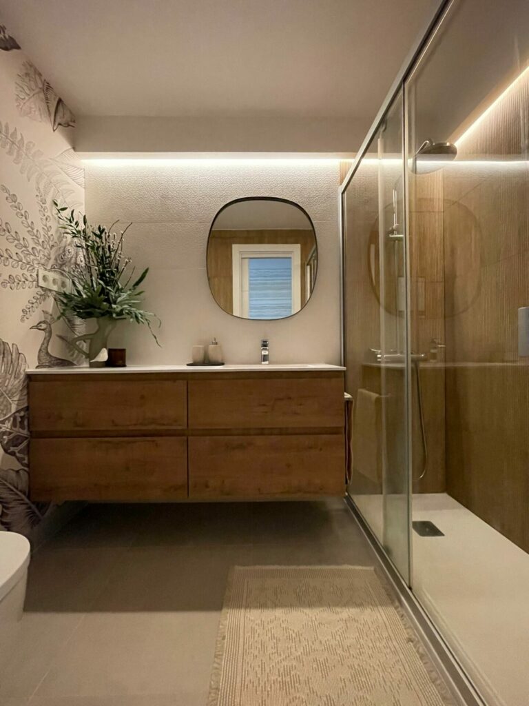 El baño, ese espacio de mimos y autocuidados en el que os hablamos anteriormente, cobra todo el sentido en estos proyectos que vamos a ver a continuación. En todos ellos, se dispone de un espacio amplio, con presencia de luz directa e indirecta que genera esa sensación de confort y bienestar, y el uso de materiales cálidos que combinados entre sí con otras texturas y formas geométricas, hacen de cada baño un espacio único y muy acogedor para tu momento de aseo y cuidado personal.