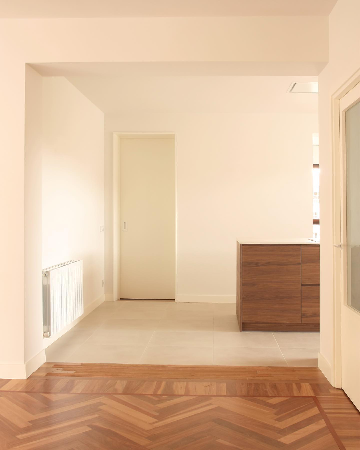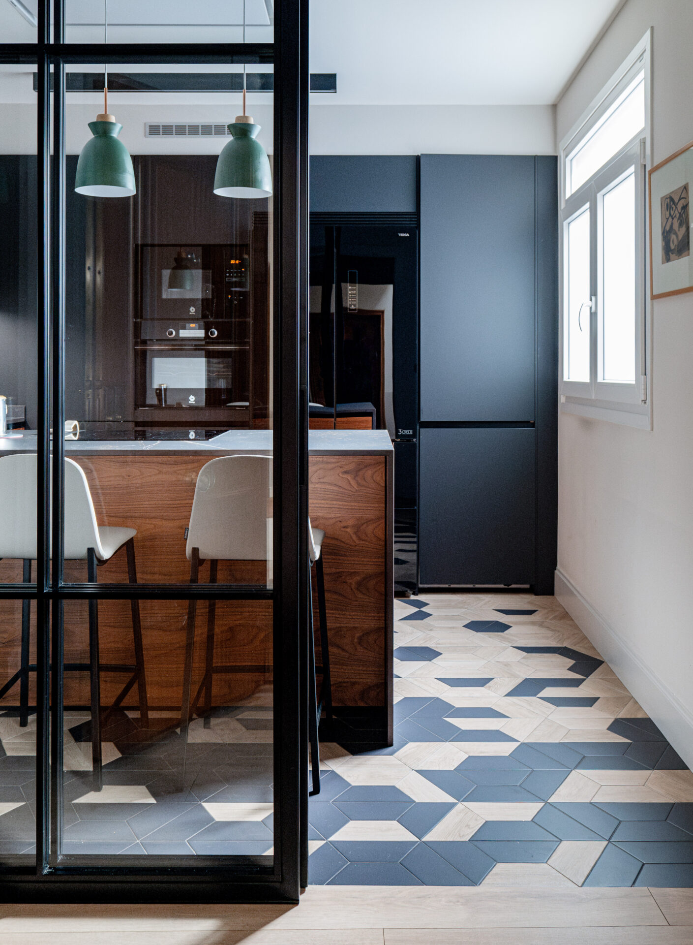 Le sigue una cocina de escándalo que partía de una distribución totalmente diferente, a la que se le ha dado la vuelta, y el resultado es totalmente nuevo, con el uso del suelo en despiece entre piezas cerámicas de acabado en madera y otras en negro, que aportan esa combinación tan fresca y actual.