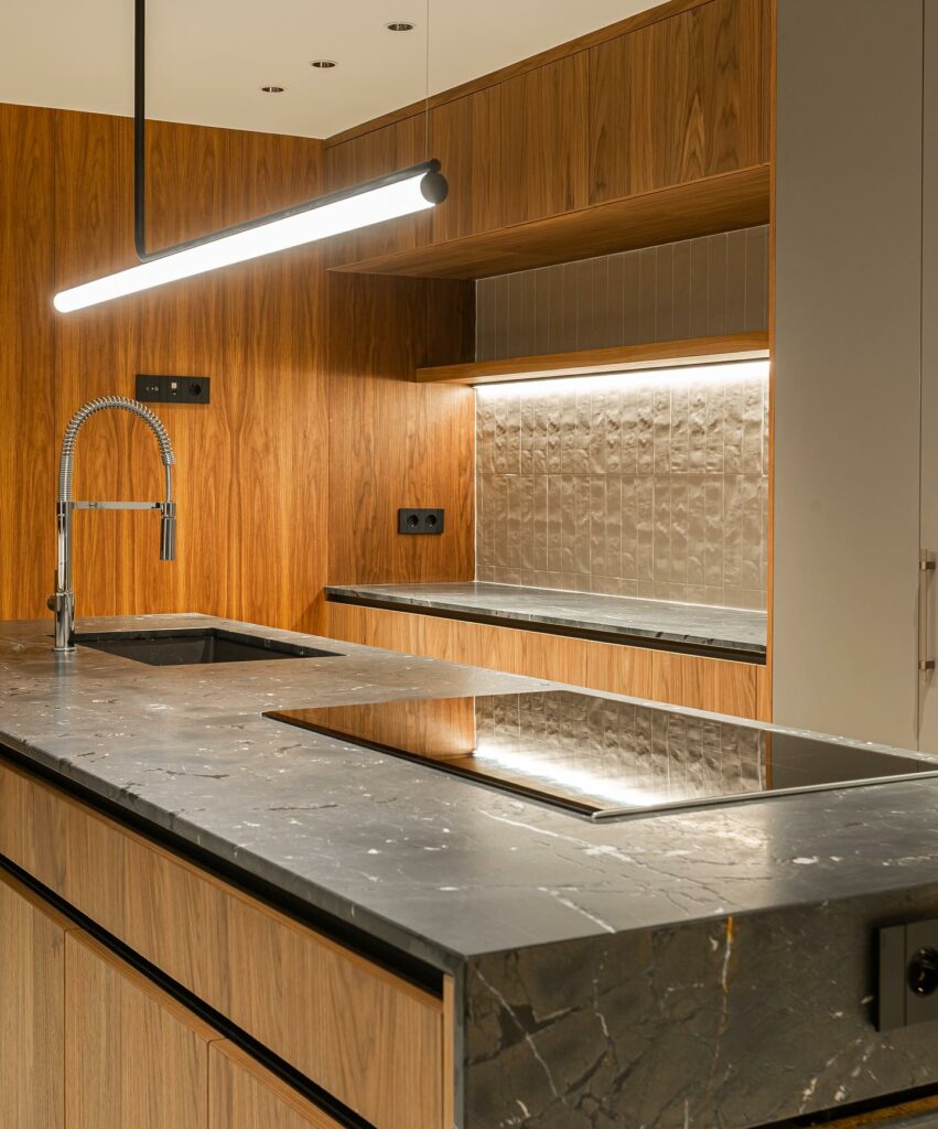 Continuamos con la siguiente cocina, en la que la combinación de madera y el color negro, también es una fórmula ganadora, además del uso de luz directa e indirecta, dando esa amplitud y separación de espacios que nos encanta.