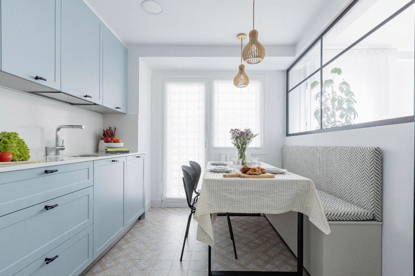 Y por último, nos enamora el suelo con baldosa geométrica que le da un estilo muy actual y muy chic a este último proyecto de cocina tan mediterráneo.