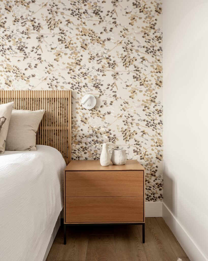 Por otra parte, este dormitorio de líneas minimal y serenas con notas de naturalidad, un proyecto en el que se ha empleado una paleta de colores tierra y mucho blanco, haciendo uso de nuestros materiales.